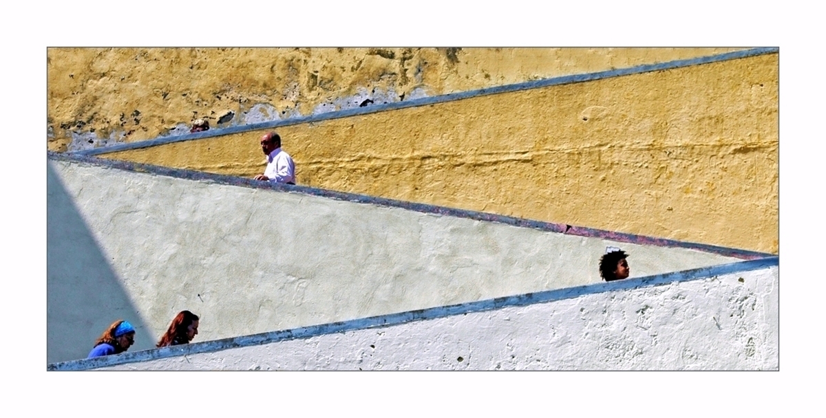 Dal titolo che hai scelto e dalle linee obbliquee che in questo caso hai fatto salire, mi portano ad una lettura un po' più concettuale, non avrebbero dovuto esserci le due figure femminili, ma solo il ragazzo e l'uomo, ma sarebbe stata un'altra foto