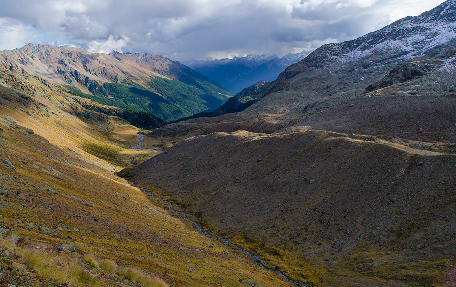 Il percorso del Noce Bianco lungo la Val Venezia, sullo sfondo le cime del gruppo della Presanella avvolte da rovesci nevosi - Parco Nazionale dello Stelvio