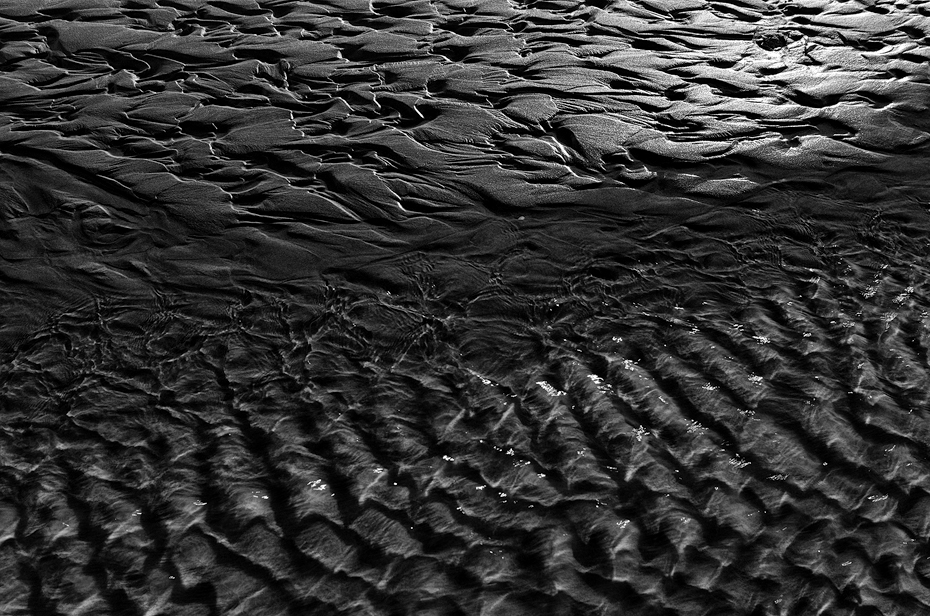 Roccia liscia, corrente vibrante , corteccia d'albero, mercurio in forma, che scorre fluido, mille materie vengono alla mente, eppure credo sia stato un semplice incontro di sabbia e onda di mare, ed ispirarti, con una efficace sottoesposizone che addensa il mistero e plastifica scurendoli i soggetti, a creare questa suggestione materica ,da un piccolo particolare paesaggistico .