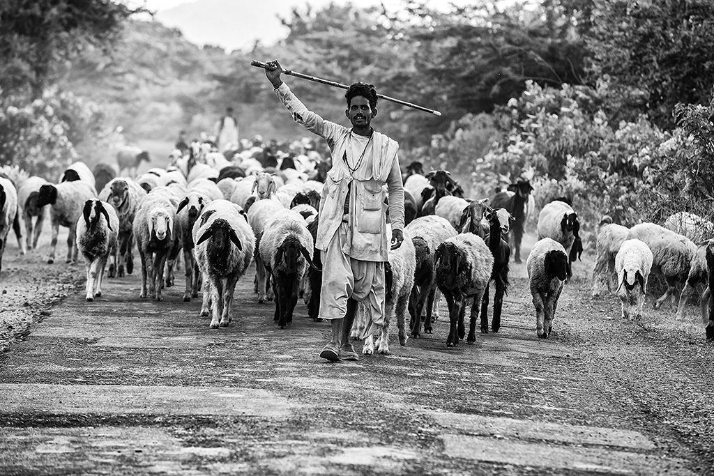Qui cogli, e lo fai bene, l'incedere del pastore, che accompagna il suo gregge per via. Il netto gesto di guida con il braccio esteso e il lungo bastone a fendere l'aria, e il folto gruppo che segue quasi in soggezione la sua guida volitiva, si fa apprezzare nel contrasto forte e deciso del B/n Tecnicamente i neri sono davvero serrati ,sui musi delle pecore in particolare, ma il mood della conversione tutta è azzeccato, per il bel momento. Ottima presa, che coglie una consuetudine di vita e lavorativa, per tramite della posizione centrale del protagonista, e anche della successione in lontananza di tutto il gruppo, compreso un altro pastore a seguito.