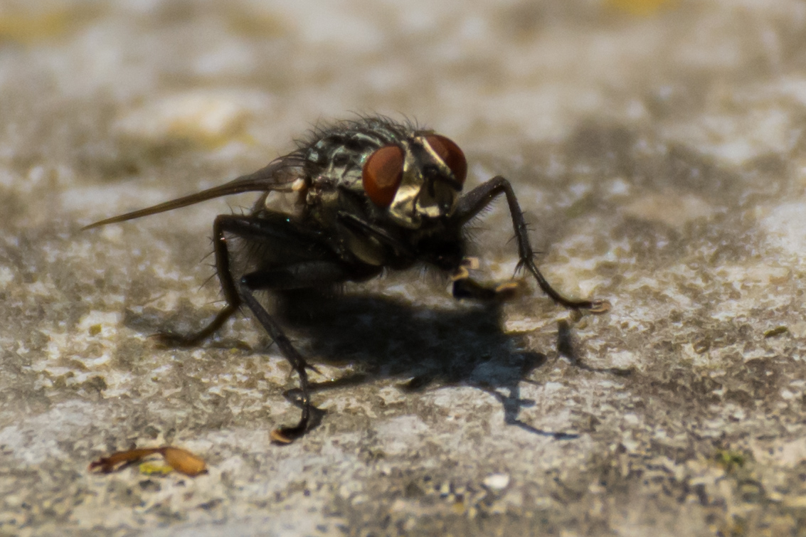 Ciao Andrea, la foto che metti a commento evidenzia purtroppo una mancanza di nitidezza generale in parte dovuta anche al diaframma troppo aperto. Immagino si tratti di uno scatto a mano libera dal tempo impostato. Per questi soggetti mano libera ed autofocus difficilmente danno buoni risultati. Le mosche sono presenti e fastidiose per tutto l'anno ed avrai sicuramente modo di riprovarci. Ciao