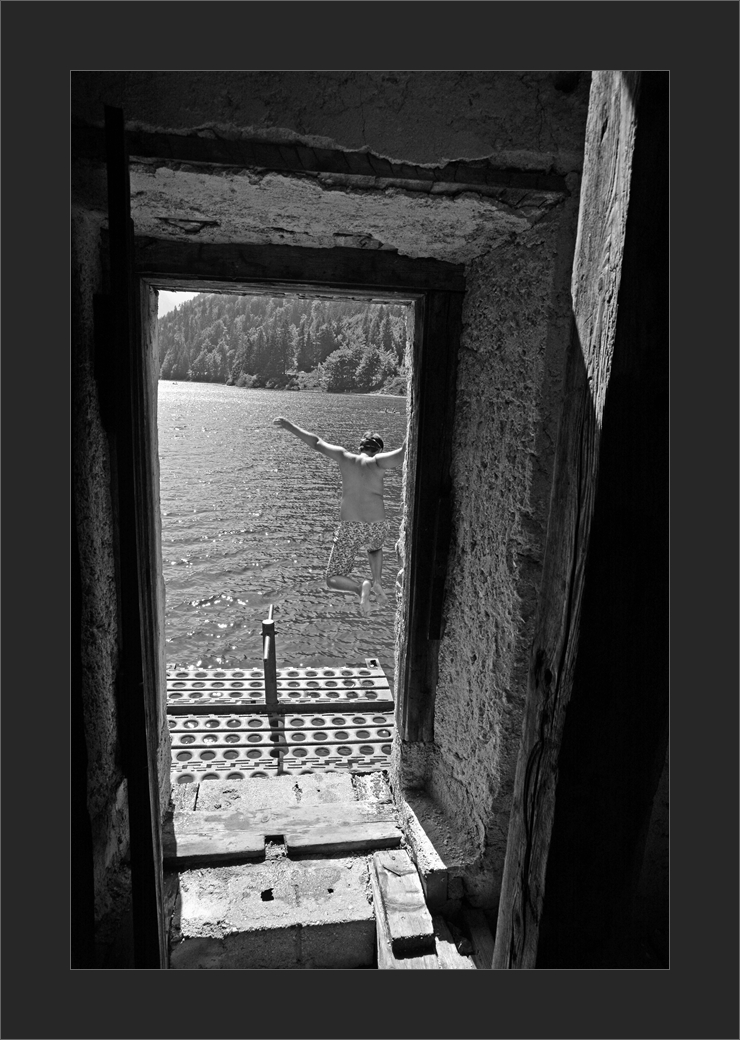 Che ottimo momento hai colto! Arriva tutto il senso di adrenalina che accompagna un tuffo o un salto (che dal punto di vista che ci offri lascia un dubbio sull'effettiva altezza),così come la spensieratezza di un momento di svago e divertimento.Mi piace anche quesro gioco di cornici un po'in decadenza che si aprono poi con un respiro sulla scena e sul volo.Bella anche la versione a colori che svela il mistero! Bravo Sergio