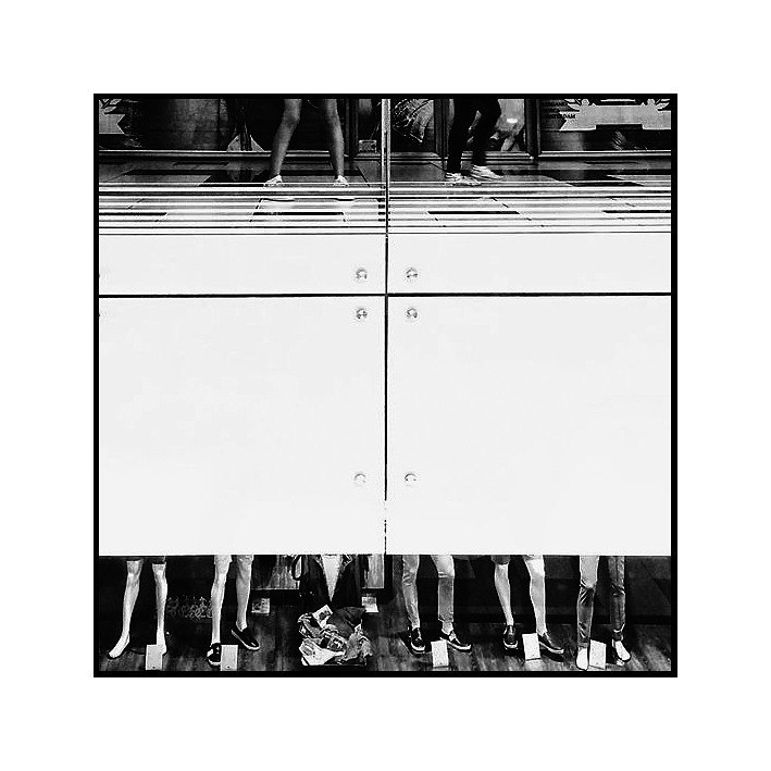 Non riesco a capire dove stanno i manichini, gambe vere, la realta' e i riflessi.