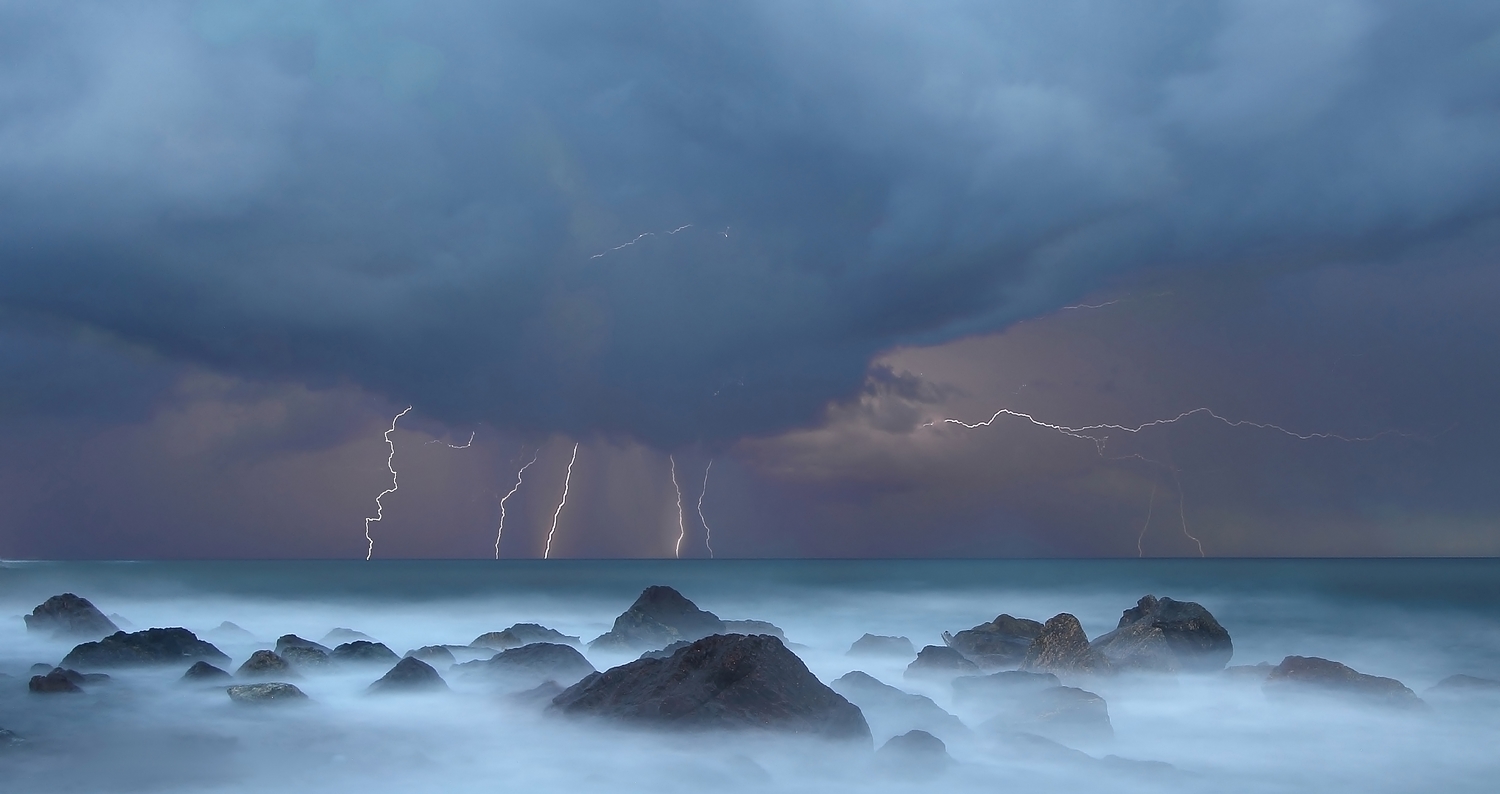 Energia che si scatena fra le nuvole, mentre la scelta oculata dei parametri di otturazione ti permette di restituire un mare fra le rocce, soffice e quasi impassibile, davanti a cotanto spettacolo.