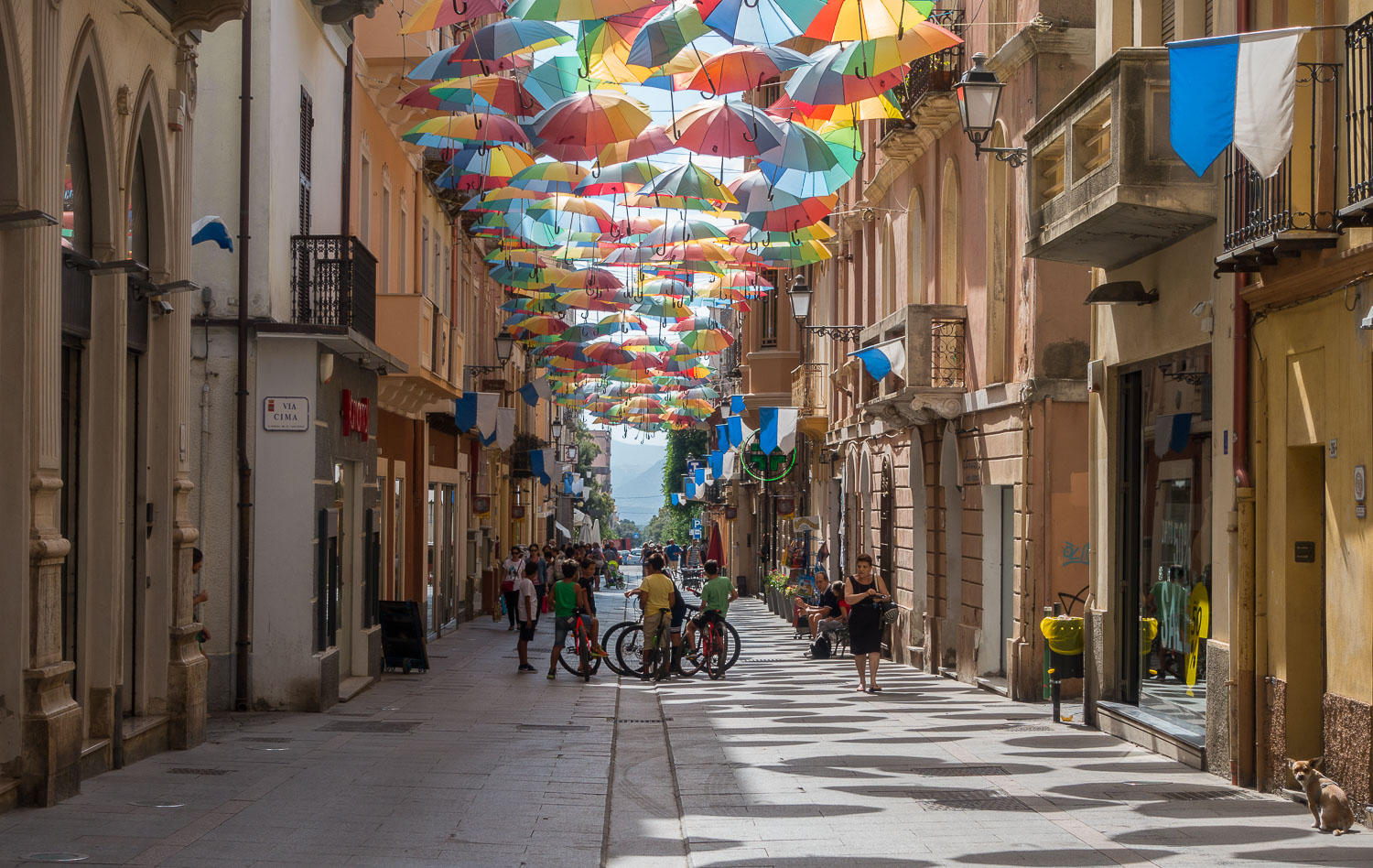 Un cielo di ombrelli colorati che mette di buon umore. E poi quei ragazzini in bicicletta con le maglie che ne richiamano le tinte.