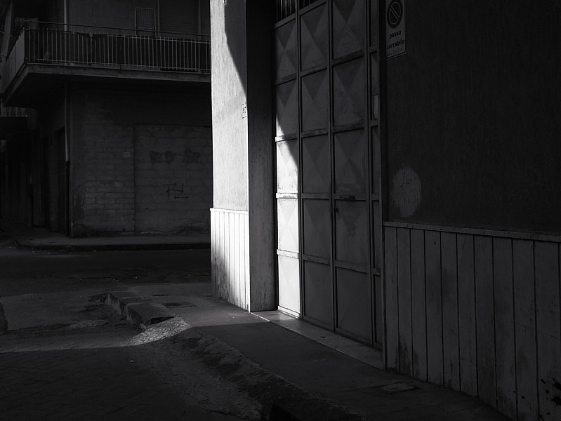 Rettangoli , quadrati, rette scure nelle balconate a ringhiera, e tanto chiaroscuro nel contesto disabitato, con una irruzione di luce intensa, che ferma lo sguardo, con forza, al centro della scena.
