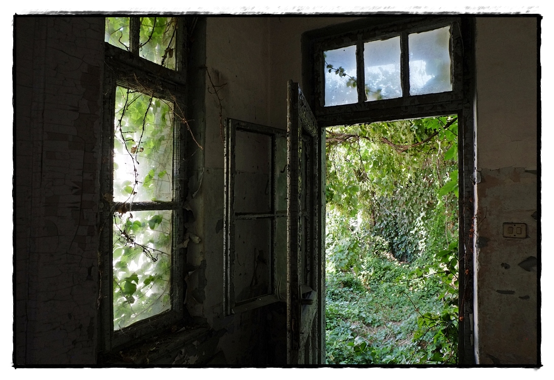 Con questo scatto mi fai venir voglia di entrare ancora in qualche casolare abbandonato dove entrando, come in questo caso, si ha la possibilità di vedere dal suo interno ...una porta aperta che non da piu su una strada magari trafficata e invasa da persone ma altresì, un " prego si accomodi" nell'altra stanza, nel salotto vegetativo. Questa volta ti sei inventato la cornice ad hoc