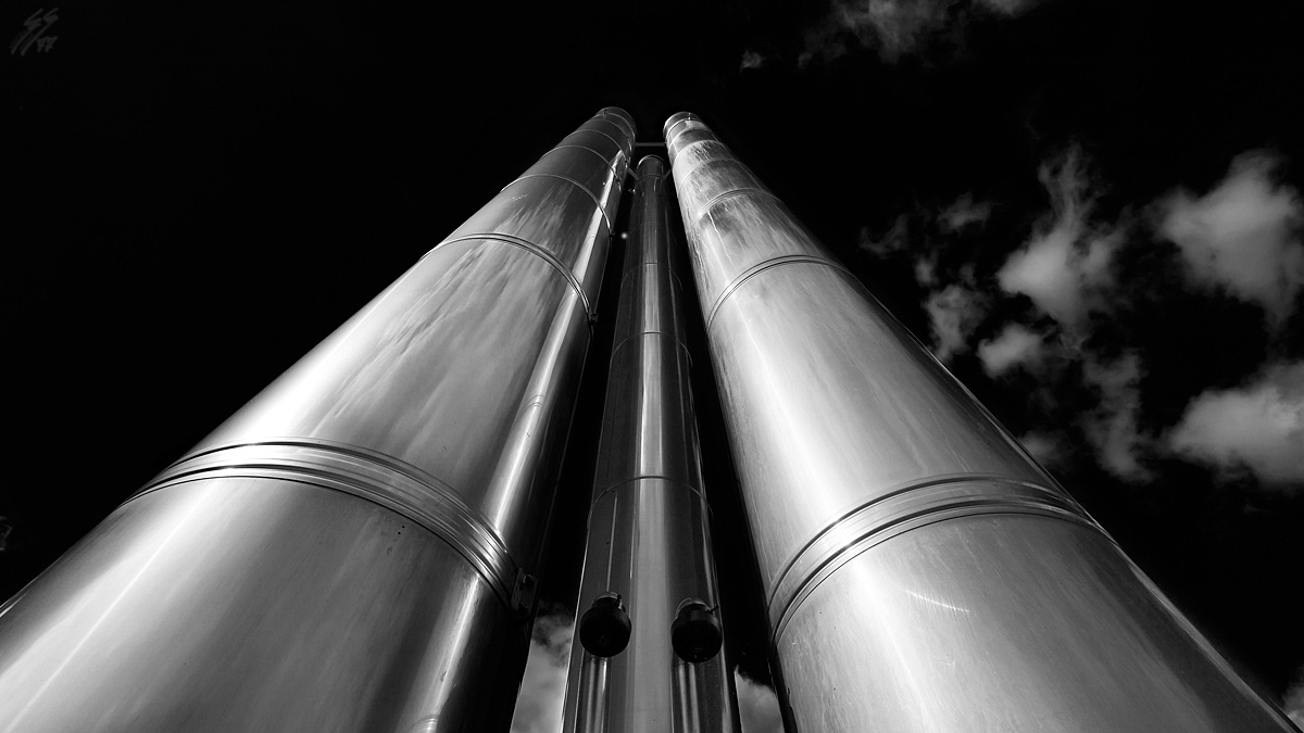 Mi piacciono molto queste tubazioni argentee che si slanciano verso il cielo. Ben vista