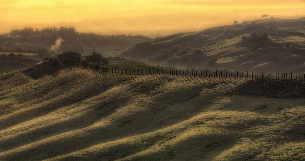 Un grande scatto valorizzato da un ottimo controluce radente che valorizza queste meravigliose onde collinari baciate da una tonalità calda e quasi ovattata.