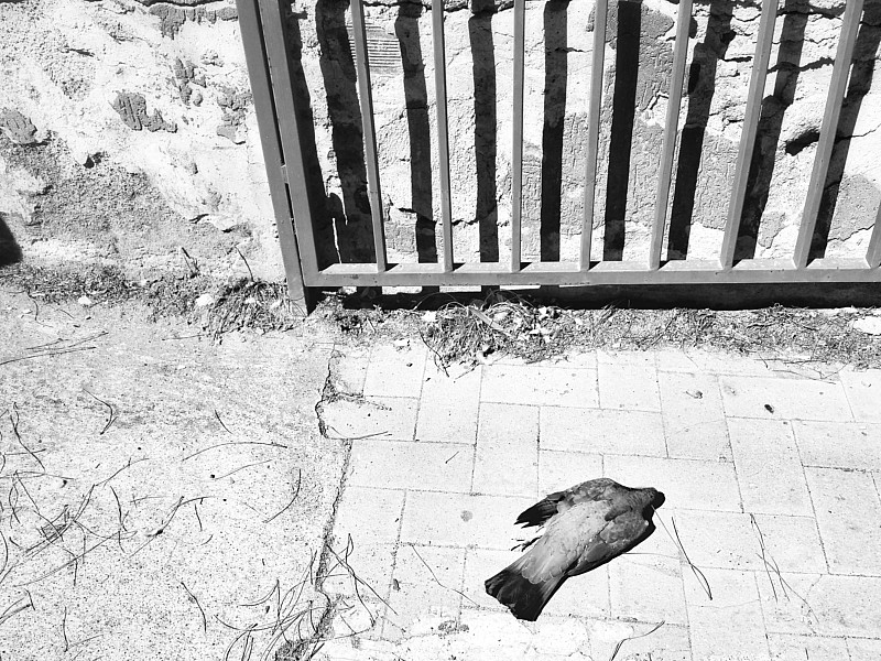 Il piccione morto è sul selciato spoglio, i pieno sole e non c'è nulla che cerchi di edulcorare questo evento; da questa foto trasudano sentimenti di morte, tristezza ed abbandono, accentuati dal contrasto con la notevole quantità di luce presente.