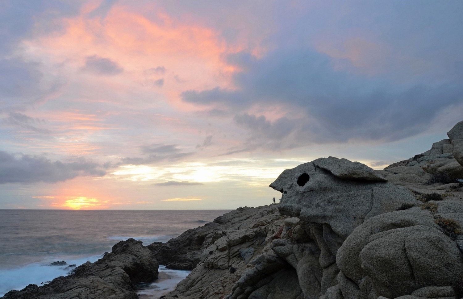 Molto suggestiva questa roccia in primo piano,un mostro di pietra che minaccia la piccola presenza umana!Bellissimo scenario che mi fa pensare alla Sardegna,splendidi colori.
