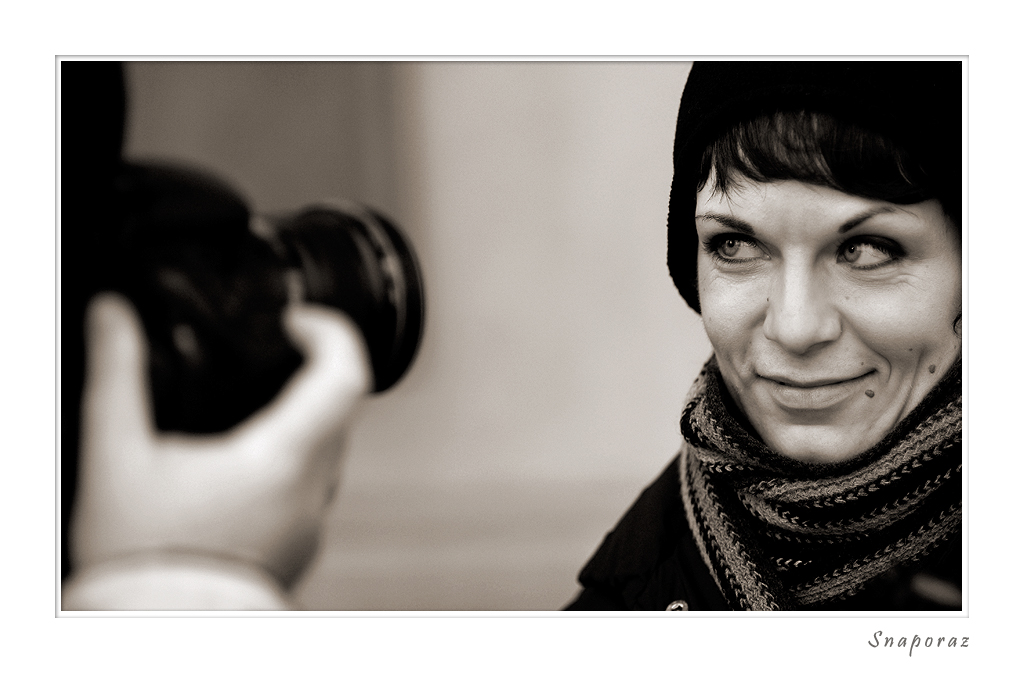 La modella e il fotografo che occupano i terzi laterali del fotogramma, il fotografo fuori fuoco, uno sfondo neutro e sfocato, un bellissimo viso, tutti gli elementi di una grane foto.. bella!