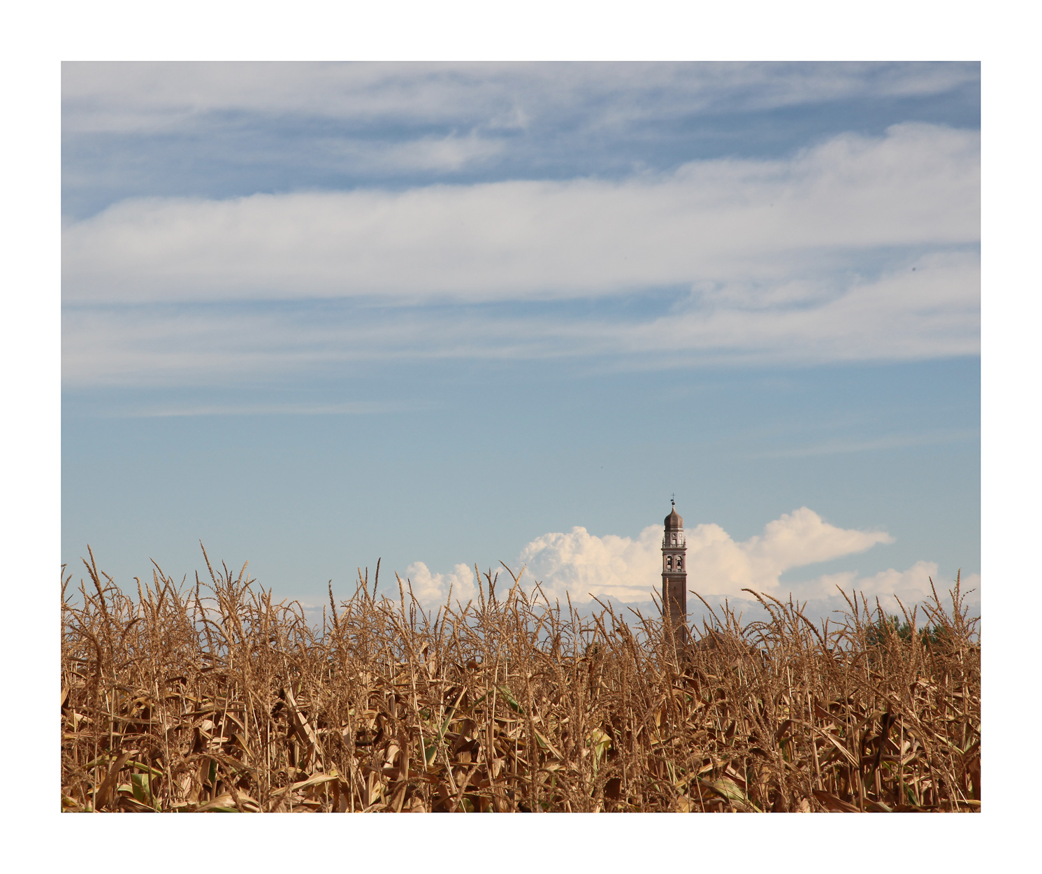 Oggi siamo in sintonia direi. Bella la luce e belli i colori di fine estate. Un campanile ed alcuni accenni di tetto guidano dal giallo del granturco all''azzurro pastello del cielo e la in fondo si stagliano sulle nubi i rilievi alpini.