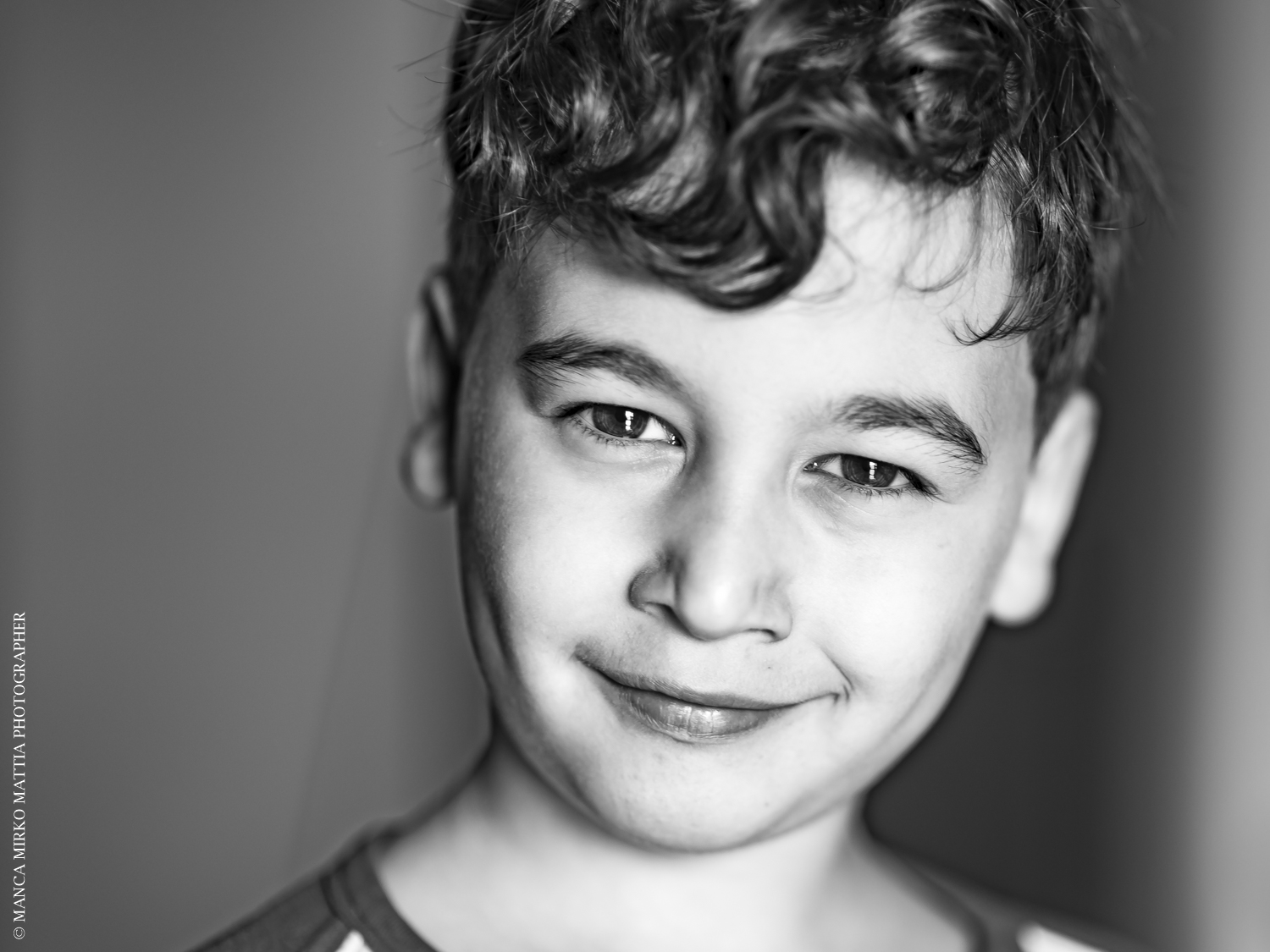 Volto ed espressione da furbetto, sguardo diretto in camera senza tentennamenti e una messa a fuoco degli occhi assai buona vista l'apertura. Personalmente trovo però disturbante la sfocatura del ciuffo in primissimo piano e troppo netto il salto con le ciocche retrostanti a fuoco; anche l'orecchio dx trovo che abbia subito una perdita di dettaglio troppo importante. Penso che una leggera ulteriore chiusura del diaframma avrebbe consentito di mantenere una buona sfocatura e, al tempo stesso, un maggior dettaglio in quei punti.