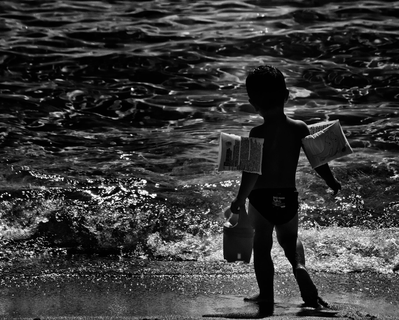 No no, la ragione è più terra terra: mare, famiglia, caldo, 1300d in una borsa ... io sbragato sotto l'ombrellone a leggermi un mattone... vedo Enrico dirigersi in solitaria verso il mare, campo libero, nessuno che lo impallasse, nessuno in mare nello sfondo ... sentivo che il bambino avrebbe assunto una qualche posa interessante e allora via ! Prendo la 1300d e scatto così com'è (in priorità diaframma con 1600 iso !!) e mi porto a casa il momento che sapevo che sarebbe arrivato nei 5 secondi immediatamente seguenti.