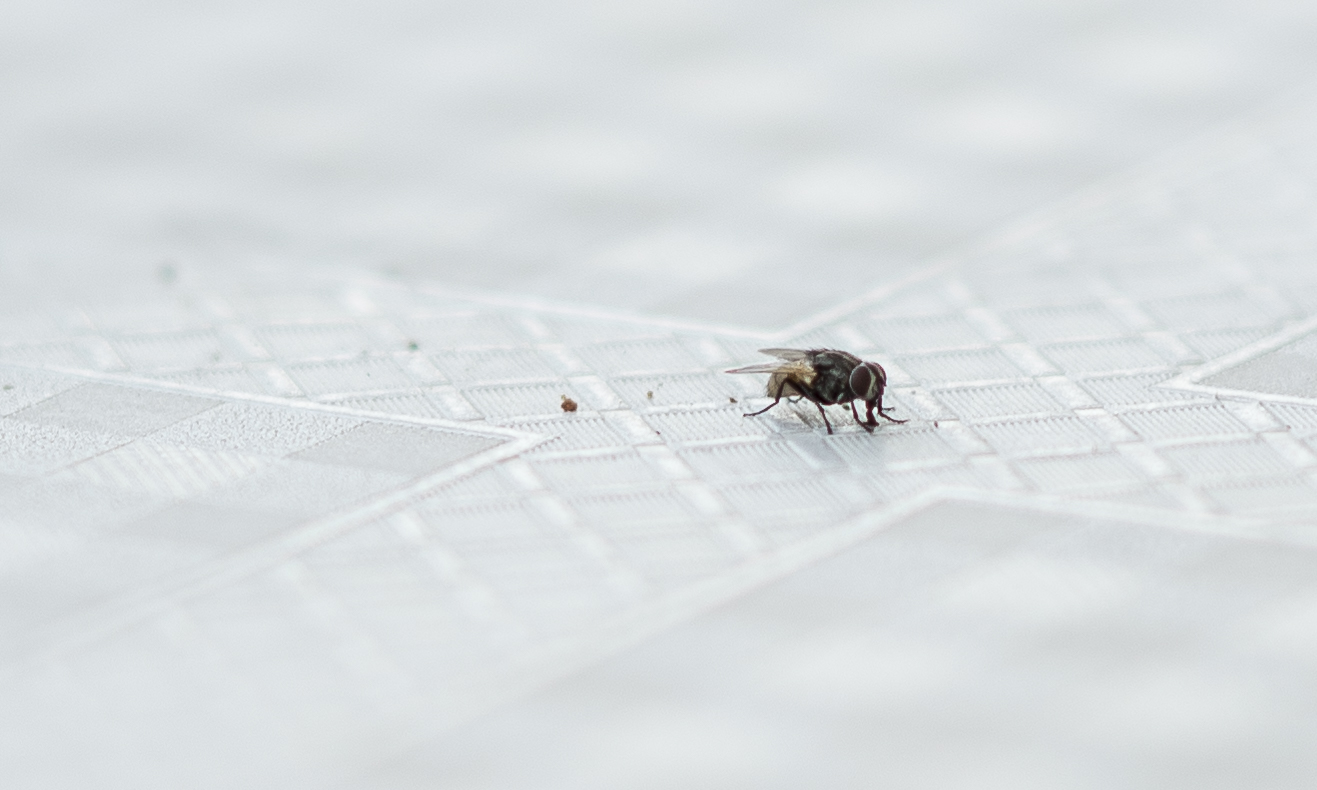 La scatto, per dirla tutta, è messo volutamente tra le varie e non nelle macro (dove non potrebbe starci neanche nei sogni più remoti) in quanto si voleva sottolineare una mosca con qualche granellino qua e là su un tessuto che da sfocato tendeva piano piano ad essere più "nitido", come una pista d'atterraggio... messa in diagonale.