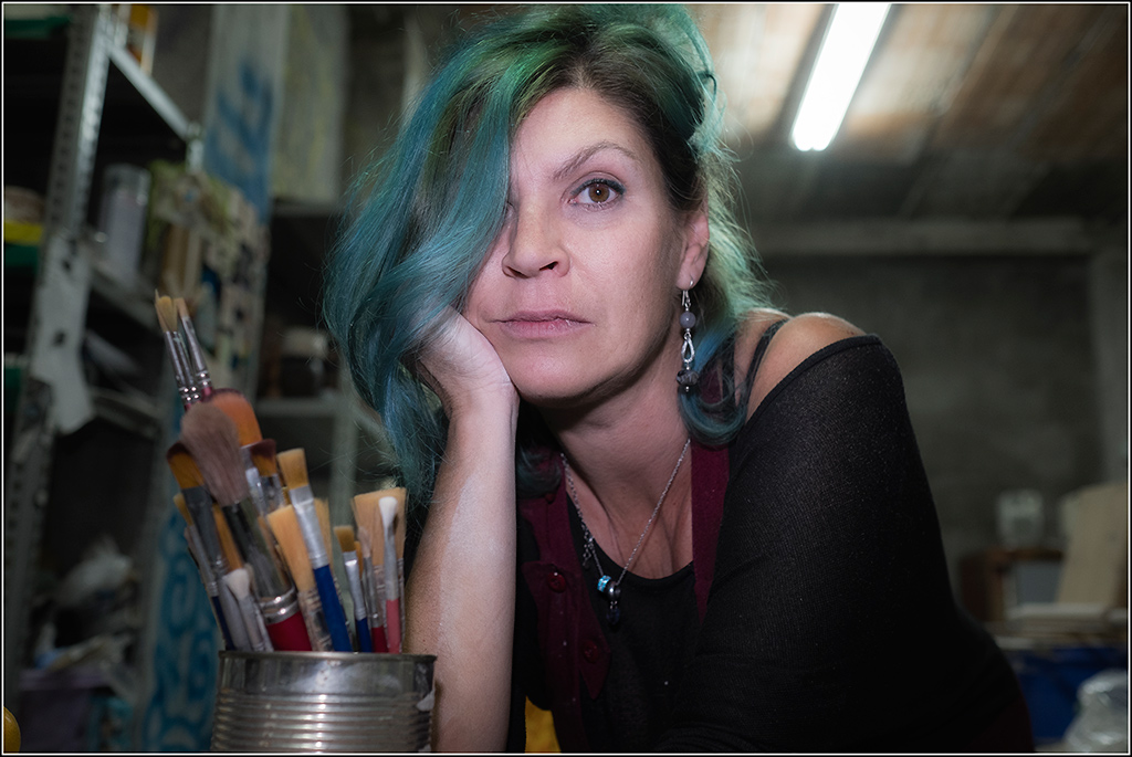 Una personalità che appare forte, sicura. Il sopracciglio alzato sull'occhio ben fisso in camera; l'altro coperto dai capelli smeraldini. Sul tavolo gli strumenti di pittura, che contestualizzano la persona e parlano di lei.