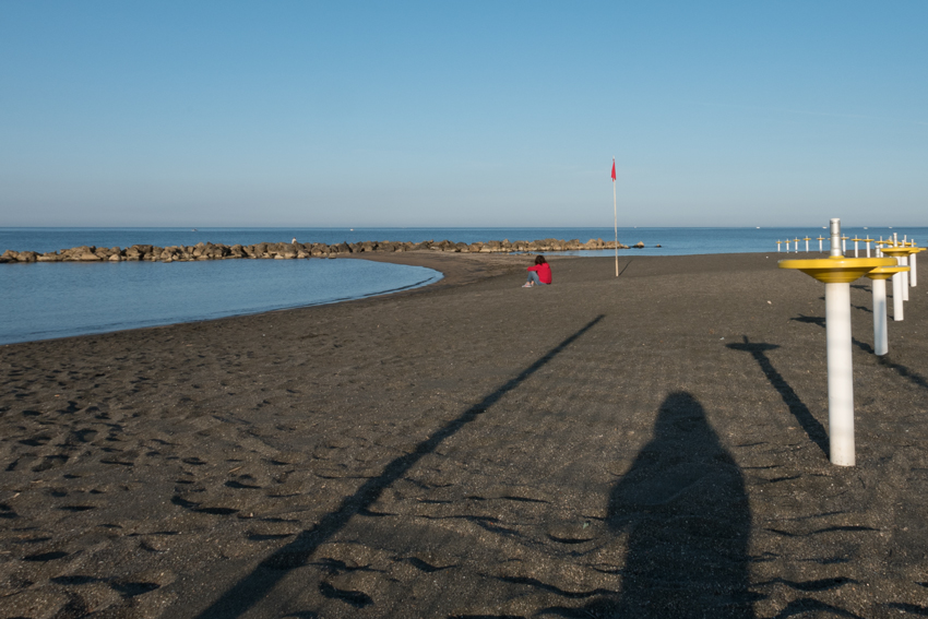 Morbida veduta marina che si fa dialogo tra ombra e la solitaria figura seduta in disparte a contemplare il mare, raccolta nei propri pensieri.