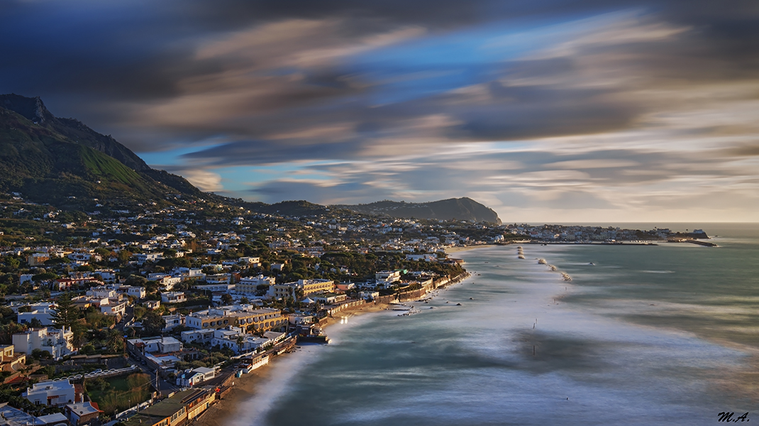Altra situazione simile a quella della foto postata ieri. In questo caso mi sono concentrato sul mio paese Forio d'Ischia, c'erano molte sfumature nel cielo e le nuvole correvano veloci quindi per lo stesso motivo dell'altro scatto ho optato per un'esposizione lunga, l'ora dello scatto è precedente all'altra, quì il sole non era ancora tramontato quindi eravamo in piena golden hour e c'era più luce.