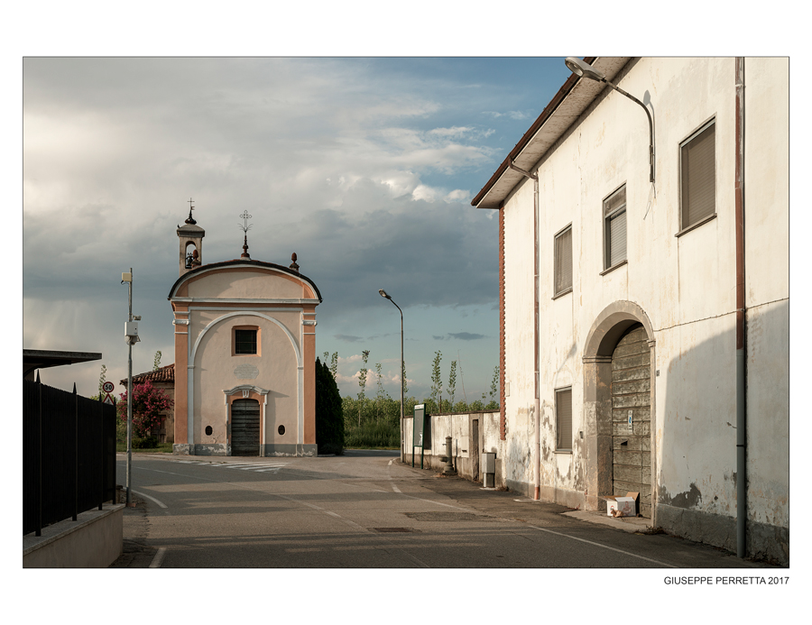Uno sguardo paesaggistico che si concentra sulla semplice eleganza di uno bivio per via, una scelta accennata di percorso, ad un crocicchio, al limitare del quale stanno le pareti a calce di una palazzina. e di una chiesetta di paese, con le ombre dolci di un sole pallido che si disegnano sui muri. Quiete e silenzio, al tuo meglio.