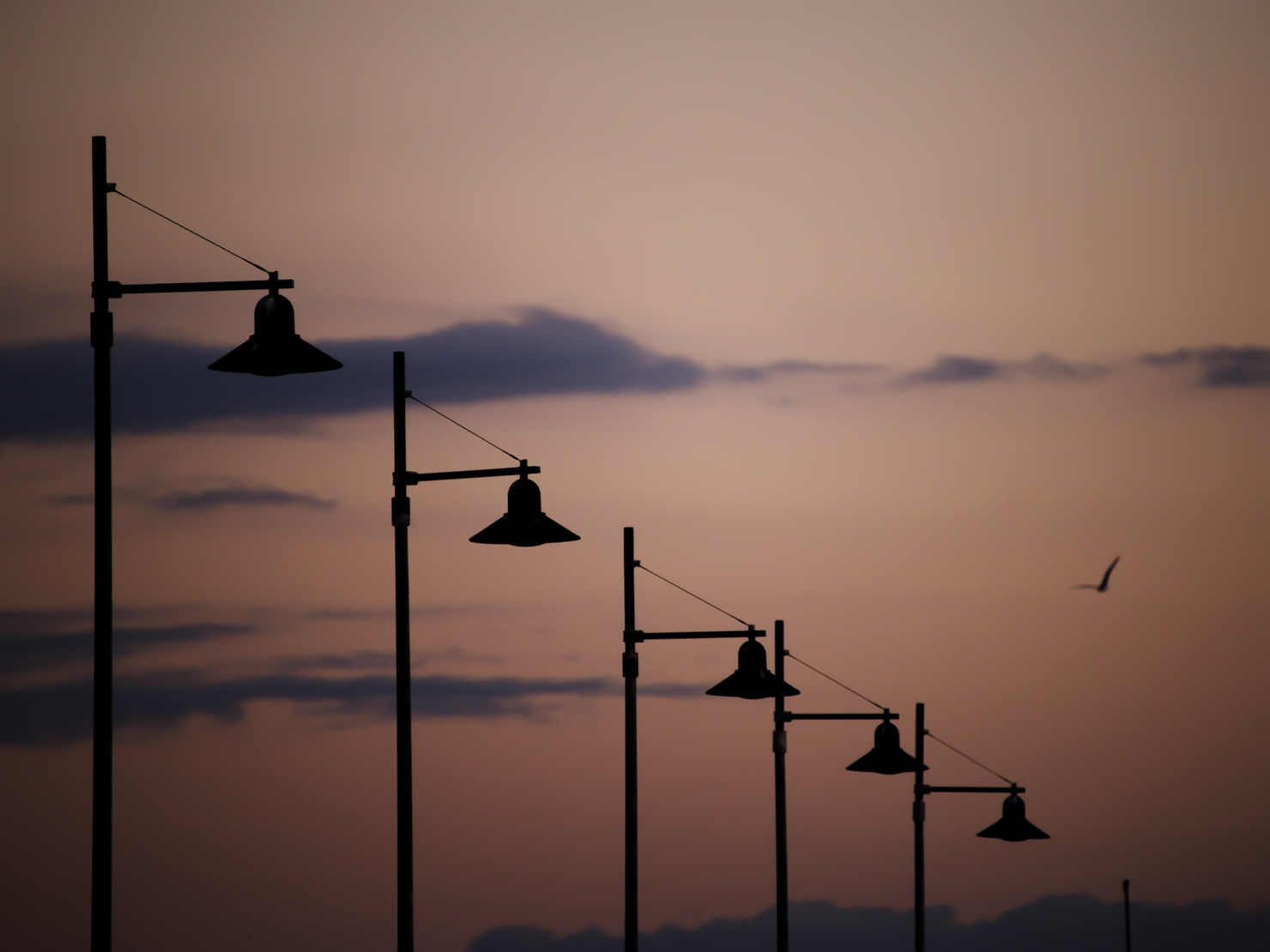 Tanti elementi comuni,lampioni,cielo al tramonto e uccello in volo,uniti in maniera ottima a regalare un immagine molto elegante e ben curata nel suo grafismo.Geometricamente accattivante la diagonale in silhouette, immersa in un cielo dalle tenui tinte pastello e con il volo a regalare un'atmosfera ancora più dolce e sognante