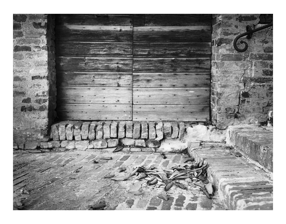 Compo ben congegnata in un ottimo bianco e nero, per rendere assolutamente coprotagoniusta il mucchio croccante di foglie autunnali, condensate e compatte come una squadra affiatata. Resta la metericità spoglia di legno del portale e di pietre, ma anche le piccole foglie hanno il loro degno palcoscenico.