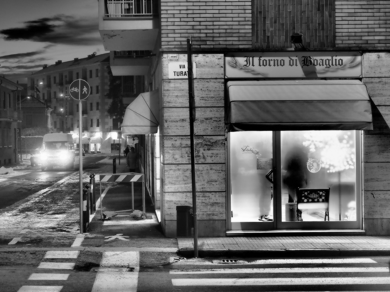 un ottimo B/N trovo interessante le figure all'interno del negozio con i vetri appannati, personalmente avrei tagliato la parte sx all 'altezza del palo ed eliminato il furgone , ovviamente è un parere personale.