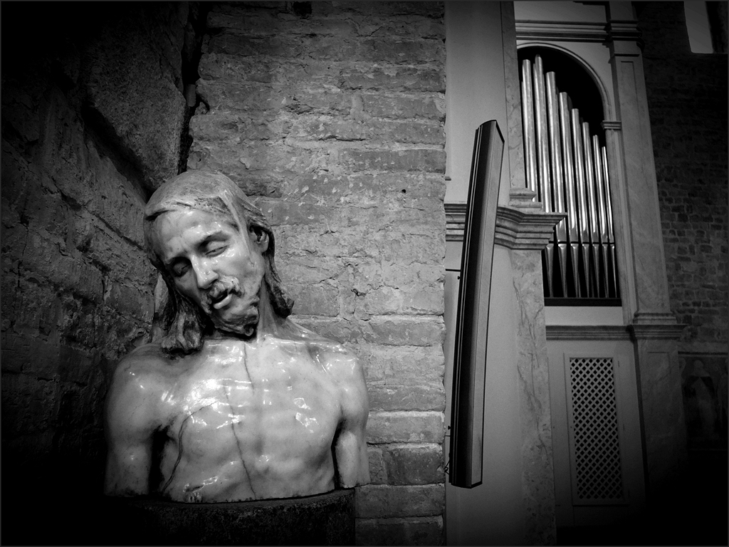 Hai sfruttato alla perfezione, quasi in senso architettonico, la bella luce. Non è un caso che la statua sia stata collocata li. Tu hai saputo cogliere il senso della scultura e della sua collocazione all'interno della chiesa. Ma hai saputo fare di più con la composizione. Anziché disturbare, gli elementi a dx fungono da complementi della rappresentazione. Quello che sembrerebbe un altoparlante, piega delicatamente verso destra, equilibrando così la diversa postura del Cristo. Le canne d'organo nello sfondo invece verticalizzano l'insieme ed enfatizzano la direzione della luce. Forse - e dico forse - avrei tentato di raddrizzare le linee cadenti. Ma non so, sai, perchè in questo caso ogni piega ha una sua ragione d'essere in rapporto a quella del soggetto principale. Sembra quasi un discorso aperto - quasi spirituale - dell'adiacenza della luce con la materia muraria, scultorea e con le canne d'organo.