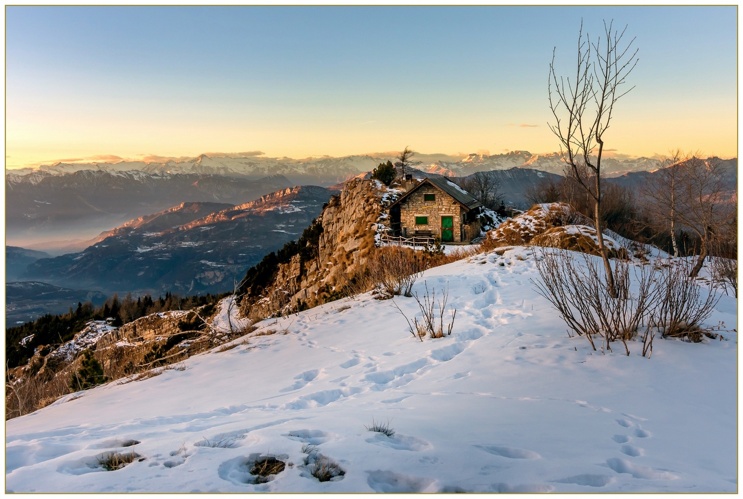 Veramente splendida. Piccoli tocchi di sole, che dora le cime lontane, e la intimità suggerita dal colare della casetta centrale, in pietra solida e ben avvolta da una parete di roccia che la preserva dal vento e dalla neve. Luoghi che conosci e che ami, e lo si avverte...
