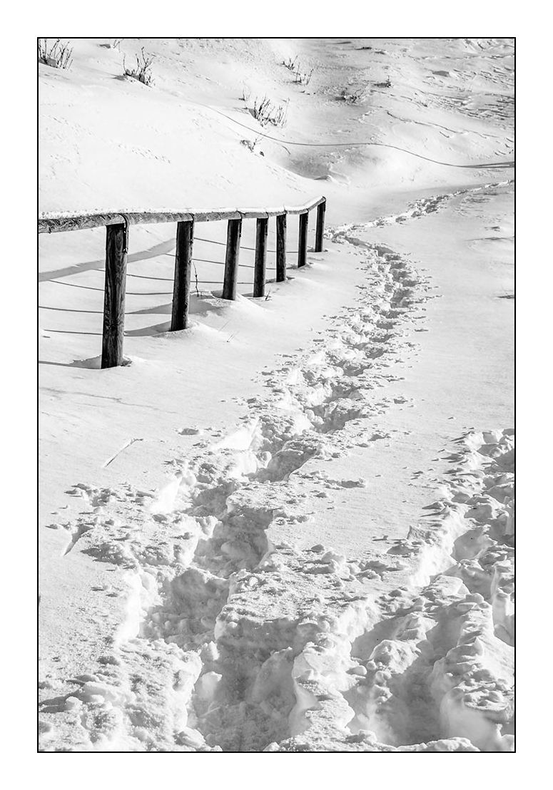 Da buon montanaro emigrato a Milano, mi ritrovo molto, in questa tua bella foto. E subito mi sono tornati in mente quel bel freddo secco, e i suoni attutiti, ben lontani dall'umidità di Milano, e del rumore della città. Bella composizione, con quel pezzo di staccionata a dare equilibrio e misure, e le impronte che si perdono verso l'alto.