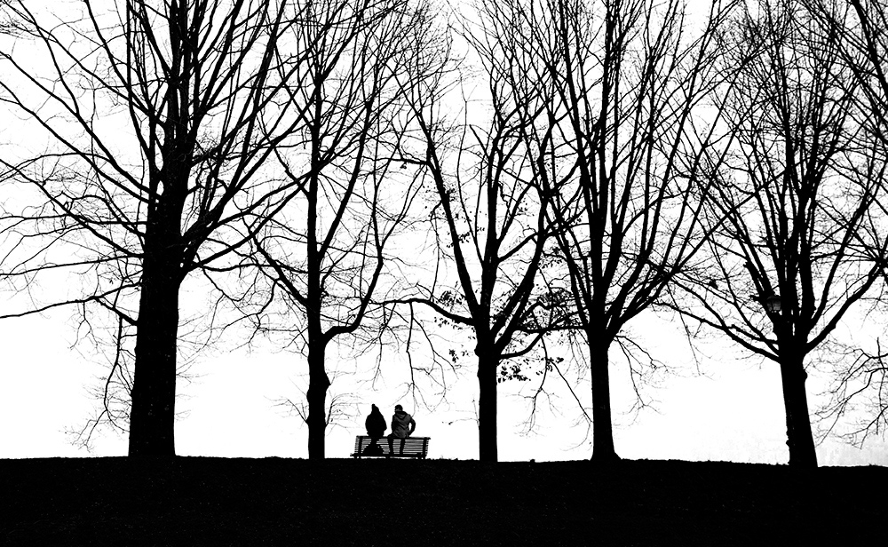 Quasi disegnata a china, l'immagine è immediatamente fruibile per l'impatto grafico. Un b\n estremamente e piacevolmente contrastato mette in risalto le due persone sulla panchina circondate dagli alberi in un clima invernale e malinconico.