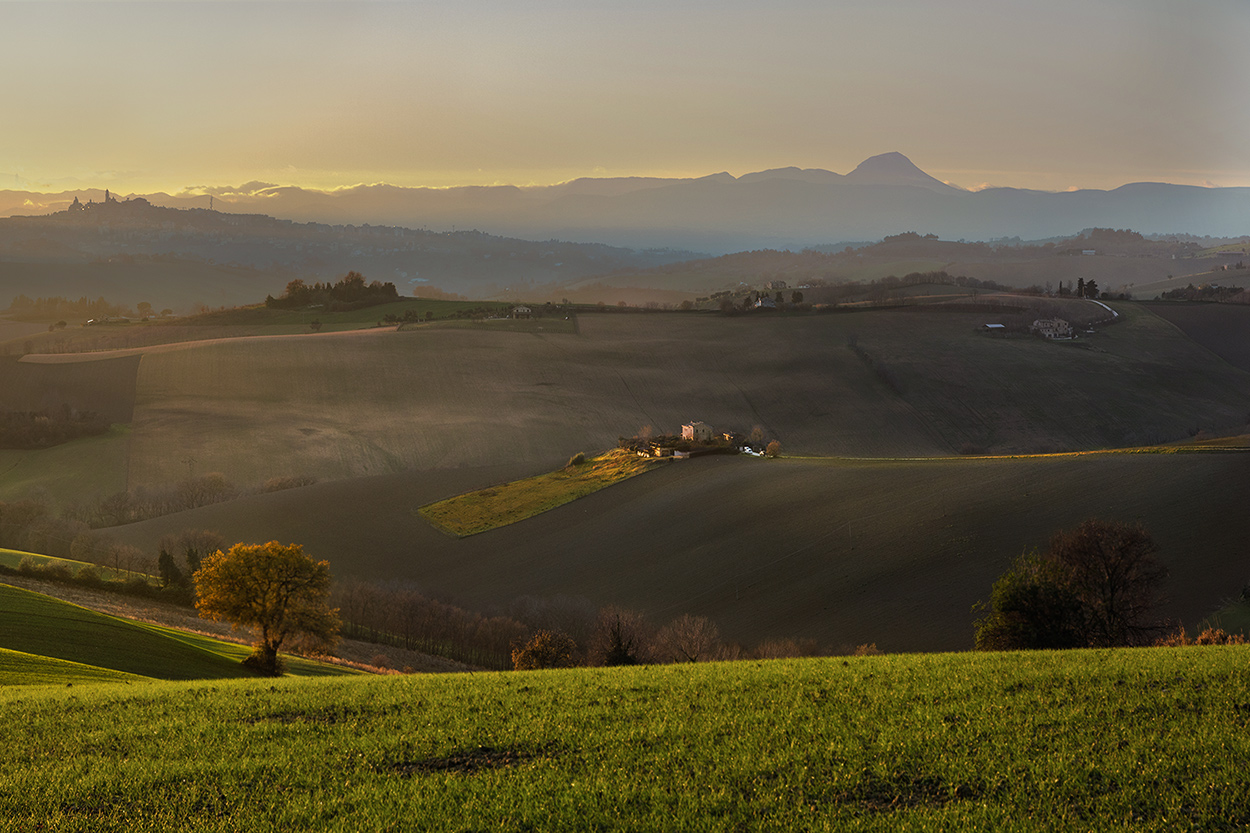 un panorama di ampio respiro, lo sguardo parte dal prato in pp si ferma sul casolare illuminato e continua fino alle montagne. Ottimo paesaggio, come sempre