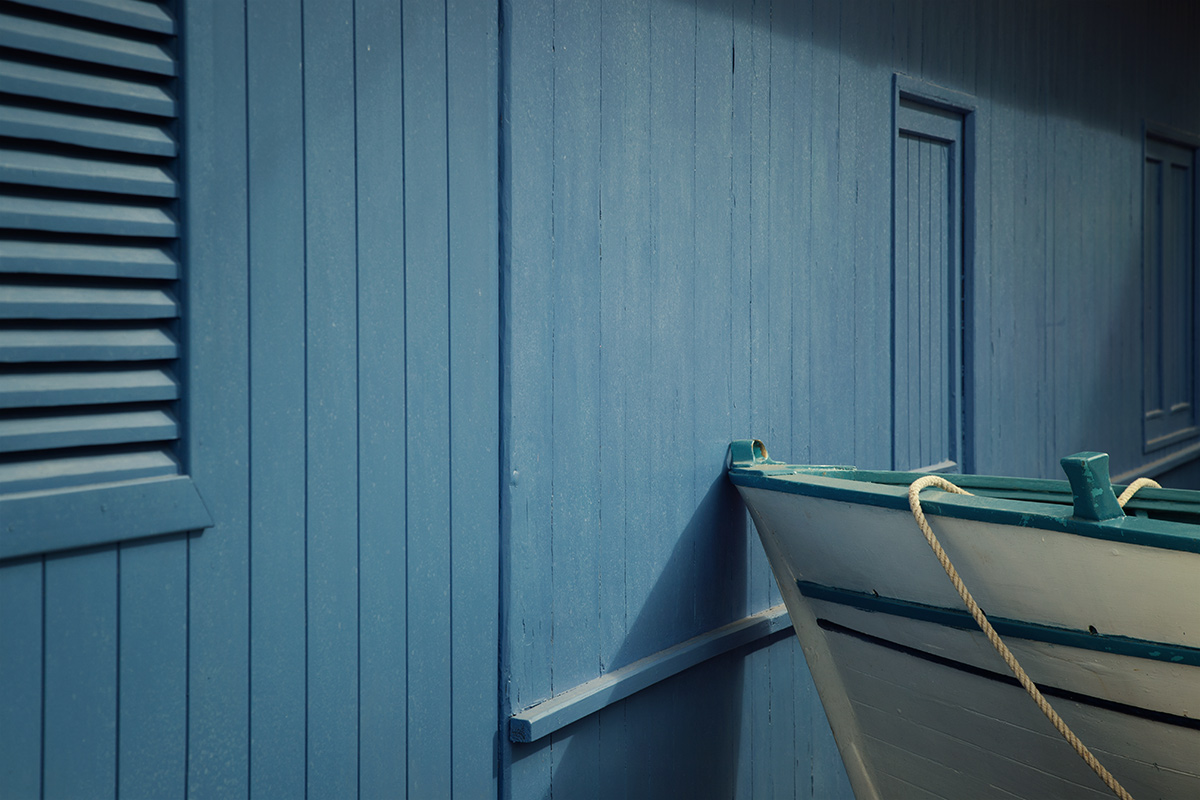 Un angolo di colore, in delicata penombra, un incontro di azzurri che mi piace moltissimo. Interessante anche il soggetto, con questa barchetta che per ora riposa in fermo navigazione contro i capanni.