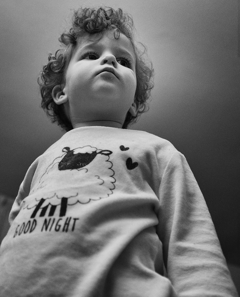 Simpatica trasgressione ritrattistica. Mai ritrarre ( salvo eccezioni) i più piccini dall'alto al basso, per non schiacciarne la figura e la presenza. Beh.. qui il pericolo è scongiurato all'eccesso, tanto da farci percepire la voglia del bimbo di sentirsi un piccolo gigante....Bianco e nero leggermente spento, ma in fondo corretto nelle gestione degli equilibri anche seleggermente crente in bianchi. In fondo è una foto di buona notte ( visto il pigiamino) , e troppa brillntezza non concilierebbe il sonno....eheh