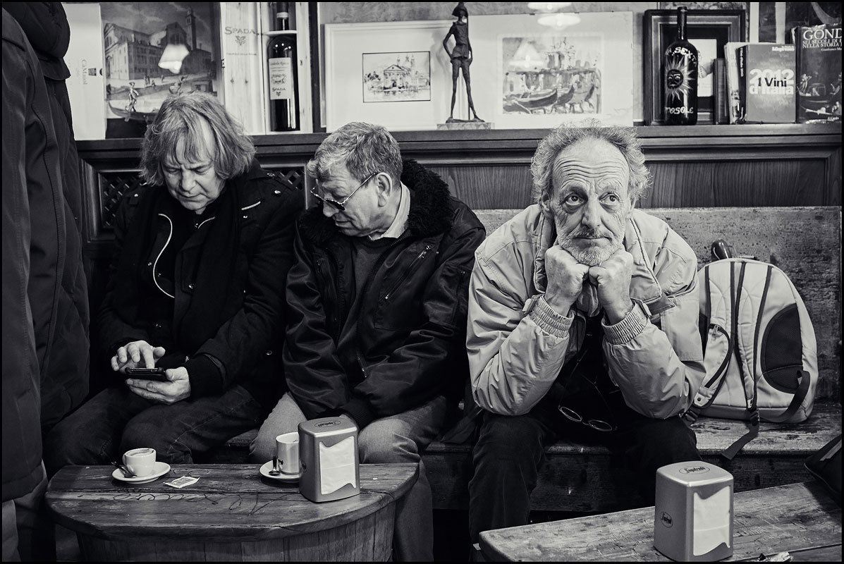 Anche per me c'è un forte spirito street, e con un bianco e nero davvero notevole . Il volto dell signore alla nostra destra è di per sè il ritratto di una situazione. Sempra pensare fra sè: tempi davvero mutati, con ste nuove diavolerie cellulari, non ci sono più le sane chiacchiere di una volta.... Wink