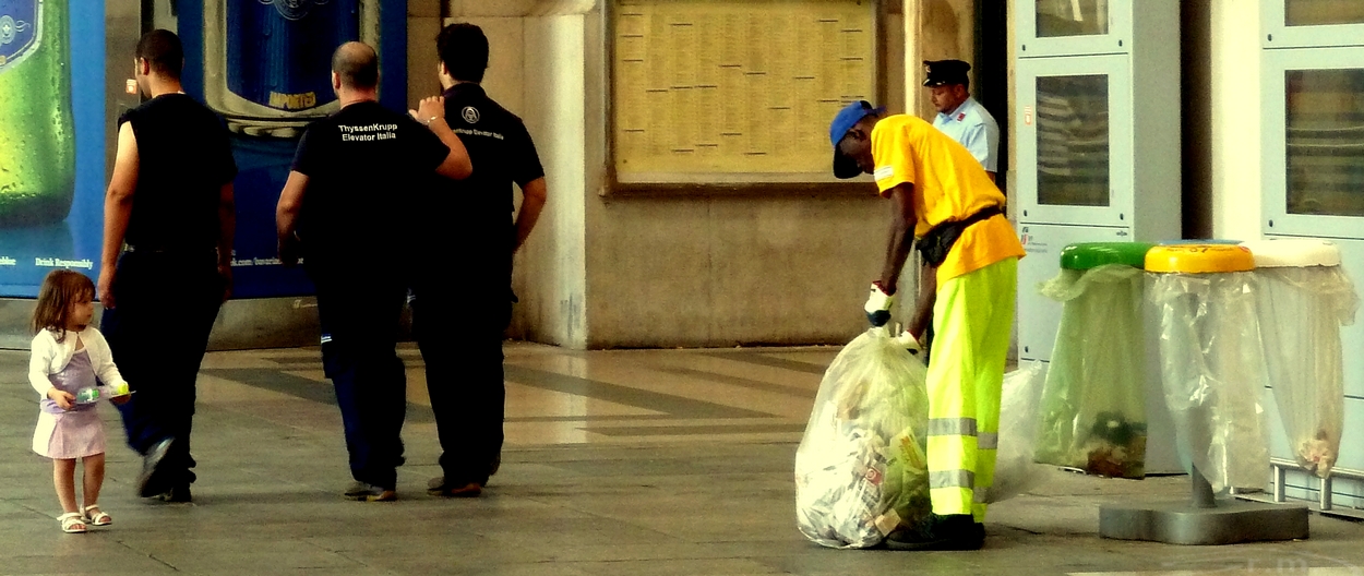 La bambina è filo del lato SX del fotogramma, per composizione e dimensioni pesa troppo "poco". Al contrario dei tre uomini in nero (altro che contorno!), ben evidenti per occupazione e colore e della guardia che è impallata dall'operatore ecologico.