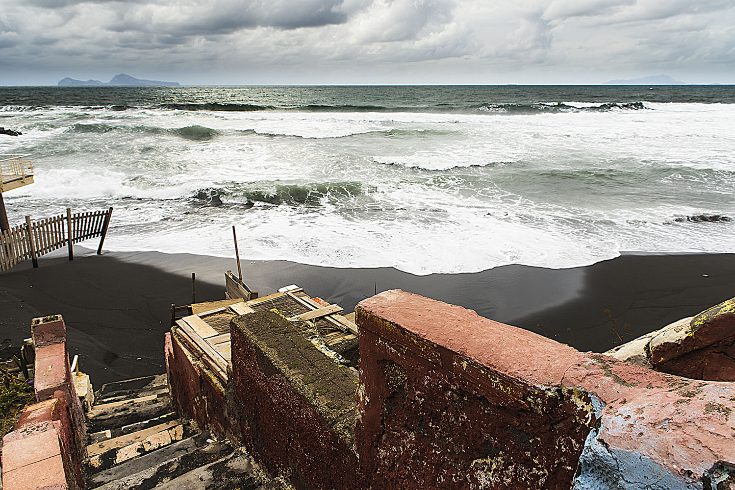 Un bel colloquio visivo di soggetti e di tinte, fra il mare in burrasca, con onde di spuma che si rincorrono , e la discesa a mare, scombussulata da una storia lunga di tempeste, e ricca di mille tinte pastello scrostate dalla salsedine e probabilmente anche dalla incuria. Compo efficace, che sceglie di includere alla base anche un paicevole triangolino di azzurro. Profondità di campo generosa ,che ci fa intravvedere bene il profilo delle isole in lontanaza, mentre forse la mdc è un po' troppo spinta, soprattutto sulla parte inferiore.