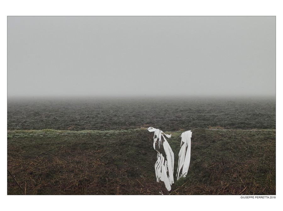 Persino un semplice telo seminterrato diventa soggetto protagonista ed irrompe nella scena prendendone possesso. Fin quasi troppo forte questa presenza in un nulla delicatamente sfumato che accompagna lo sguardo verso il celato orizzonte.