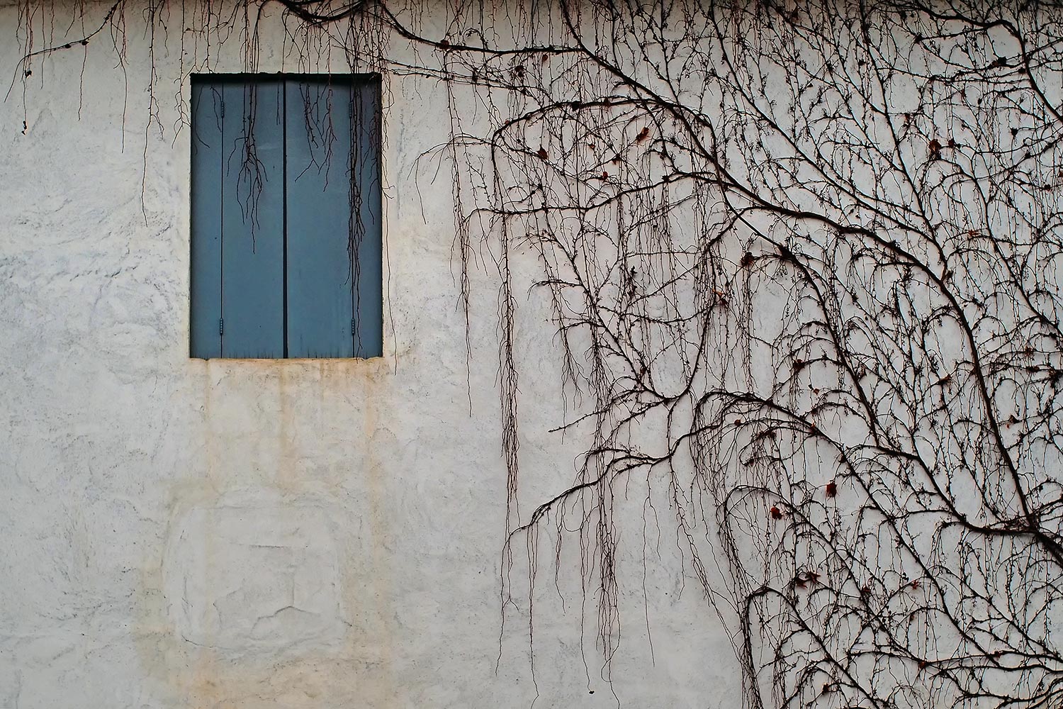 i rami dei rampicanti sembrano ricami sulla parete rallegrata dalla finestrella azzurra. Mi piace molto