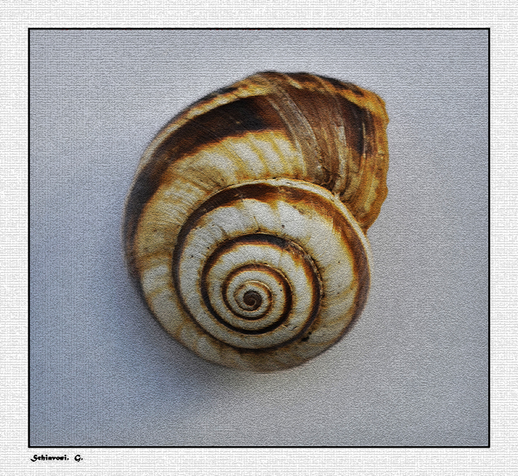 La semplicità suggestiva di una della miriadi di esemplificazioni di spirale aurea in natura. La natura tessile... eheh della resa finale è in bilico fra eleganza dosata e un piccolo eccesso di abbellimento. Naturalmente parere solo personale. Indovinata la tonalità azzurro cenere del riquadro acconpagnantesi alle tonalità brune della conchiglia.