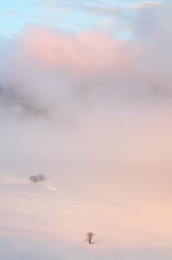 Soffice ed evanescente , delicata come una emozione sussurrata. Formato verticale che esalta la quasi continuità di colore e sostanza fra cielo e terra, fra manto nevoso e forme nuvolose, entrambi rosati da raggi filtranti di sole, con il dilemma risolto dalla piccola presenza di chiome solltarie che emergono dal bianco e di uno squarcio arioso di azzurro alla estremità finale superiore. Foto apparentemente semplicissima, ma squisitamente complessa da comporre, volendo creare un perfetto equilibrio fra registrazione descrittiva e componente emotiva.