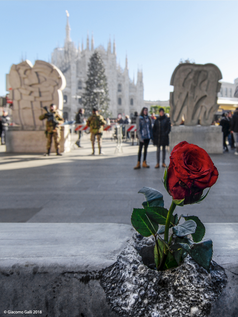 La prima barriera da superare è quella dell'emotività che mi blocca un attimo su quella rosa un po' avvizzita che mi parla di un qualche sacrificio, chissà forse proprio sull'altare di ciò che stanno proteggendo quei militari alla seconda barriera, la libertà.