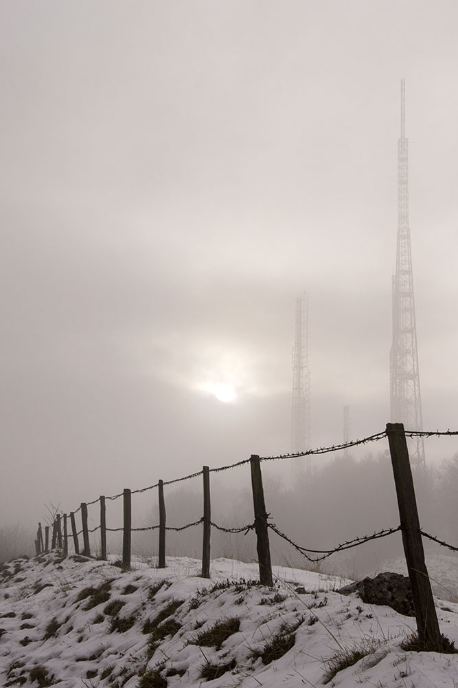 Le antenne,come fantasmi,si ergono nella nebbia a captare lontani lamenti evocati dai dolenti reticolati in primo piano.Anche il viraggio concorre a creare questa atmosfera che ci riporta a tempi bui.Immagine di gran suggestione che conservo tra le preferite. Ciao,Sergio. Smile