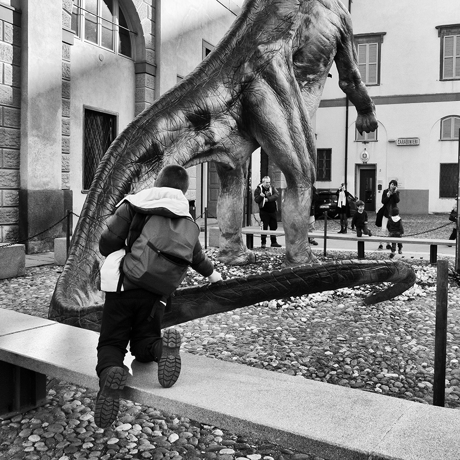 Il dinosauro non è un T-rex, ma un altro di cui non ricordo il nome, ce ne sono diversi molto grandi in giro per Bergamo. E' un'iniziativa originale e curiosa che a me piace molto. Ho anche altre foto piu' belle di quella che ho pubblicato che raccontano proprio le diverse reazioni dei passanti ma per questione di privacy non posso pubblicarle. Non appena il tempo lo permetterà comunque sicuramente farò qualche altro scatto a questi "bestioni" e se sarà possibile sicuramente posterò ancora qualcosa.