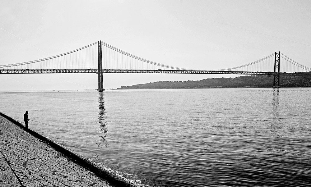 Mi piace questa tua visione. Il piccolo pescatore, dai neri serrati, e conseguentemente quasi una silhouette, nella sua piena lateralizzazione compositiva, trova paradossalmente un vero protagonismo-centralità, nella ripresa. Però permettimi di rilevare che senza la maestosa presenza della campate del ponte, e delle formichine in transito su ruote nella lunga carreggiata, la scena non vivrebbe della stessa ariosità e fascino, fra acqua e cielo. La semplicità del gesto del pescatore , trova nel miracolo architettonico che colma il paesaggio, il suio contrappunto perfetto e la sua bellezza valorizzata da un sinergico alleato. Sono un tutt'uno.