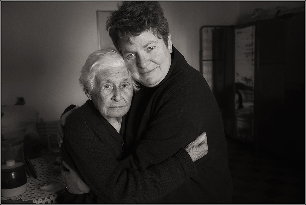 Bellissimo ed emozionante doppio ritratto.Ottimo bn.Mi piacciono le espressioni differenti delle due diverse generazioni di fronte alla fotocamera.Quella più anziana ne ha quasi timore e cerca forse protezione nell'altra più a suo agio.Immagino madre e figlia legate da un rapporto d'amore lungo una vita.Complimenti e preferita.  _________________ Sergio Demitri https://www.flickr.com/photos/124946035@N02/ |