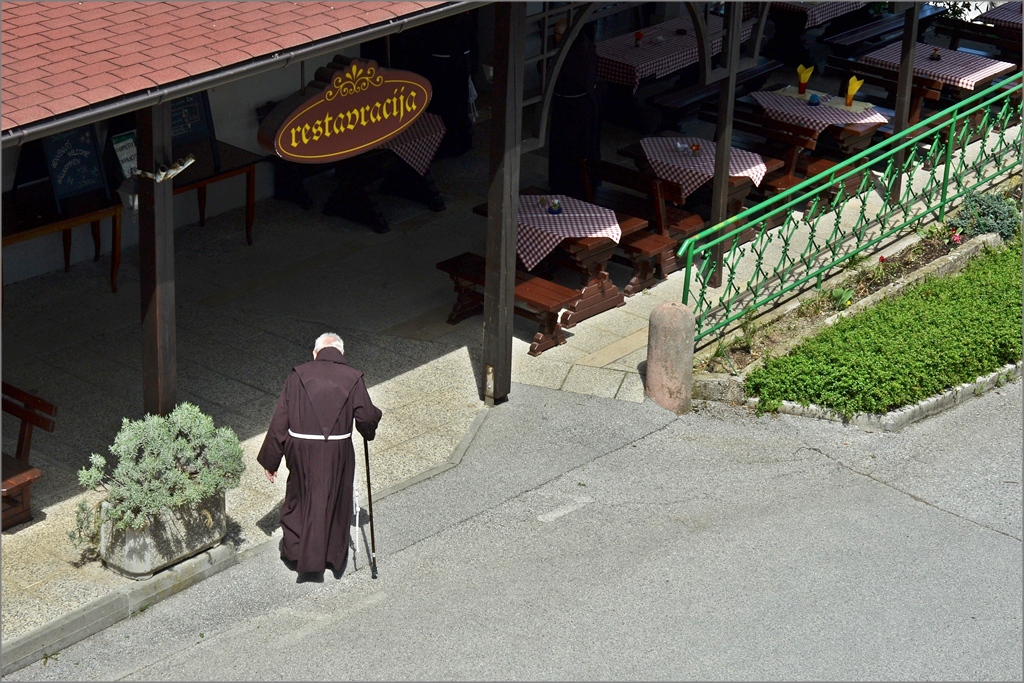 Grazie Tropico e Max,ma qui la composizione era semplice.Si Max il monaco più anziano seguiva altri due più giovani che già erano entrati nel locale.Qui pranzano regolarmente perchè sarebbe antieconomico tenere una cucina interna al Santuario per pochi monaci.D'altronde il ristorante,attiguo alla chiesa,si mantiene sui molti pellegrini in visita.Quando i tre monaci sono rientrati portavano un contenitore con il cibo per un confratello infermo che non poteva muoversi. Ciao