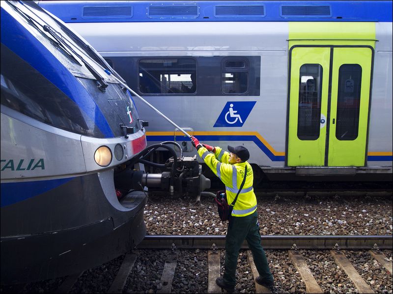 Ero appena sceso da questo treno e mi apprestavo ad uscire dalla stazione quando ho notato l'operatore che lavava il cristallo della locomotiva.
