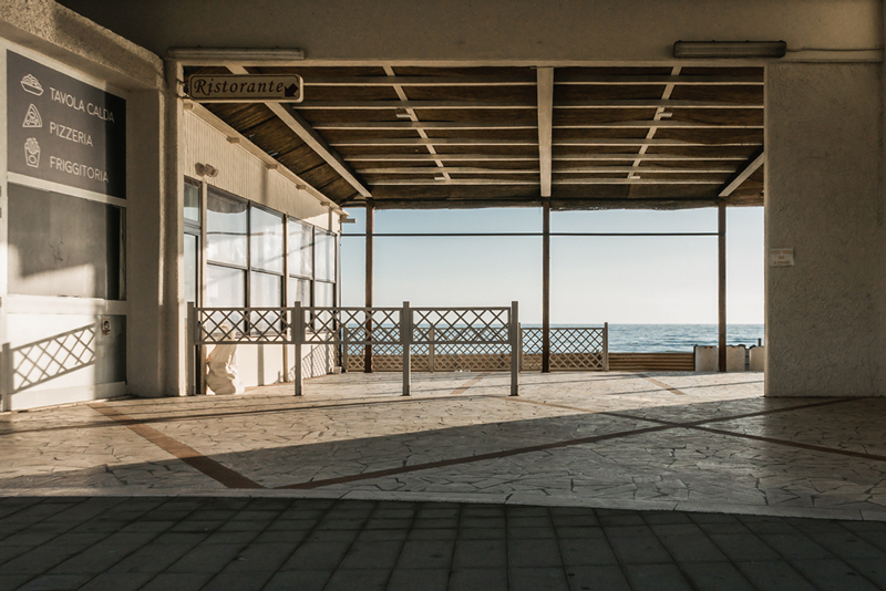 Concordo : un mix architettura paesaggio che si compone nella luce piena e nella ariosità dello scenario azzurro che si dispiega oltre il porticato. Nessun commensale per qeusti esercizi in letargo... e ampioogioco a linne e disegni d'ombra.