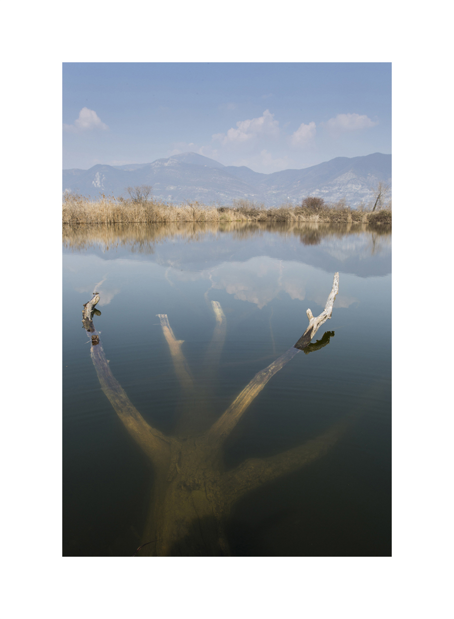 Nella serenità generale di questa visione quieta e luminosa, la scelta di rendere tecnicamente emergenti le forme sommerse oltre il pelo d'acqua, porta vita alla mano gigante... e il rami ,come lunghi artigli, portno una particolare nota inquietante. Ottimamente resa anche dal punto di vista tecnico. Molto bene.